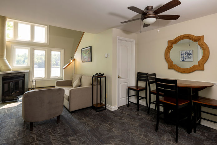Our One Bedroom Lofts are ideal for an intimate getaway in Muskoka. Each loft features a primary bedroom with a king size bed, a separate living room and a 4-piece en-suite bathroom as well as a kitchenette that comes fully-equipped with a mini-fridge, coffee maker, microwave and more. Air-conditioning and two flat screen televisions with 60 channels to select from are just a few of the amenities you will enjoy during your Muskoka escape with us.