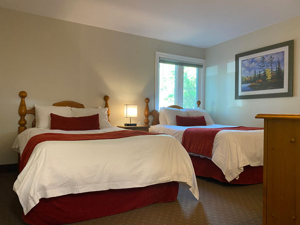 Our Standard Two Bedroom Suites are equipped with a king bed in the primary bedroom, two double beds in the second bedroom, a four-piece bathroom and separate living room with a pull out sofa and fireplace. Each unit has a kitchenette with a microwave, mini refrigerator, sink, coffee maker and kettle. Air-conditioning and two flat screen televisions with 60 channels to select from are just a few of the amenities you will enjoy during your Muskoka escape with us.